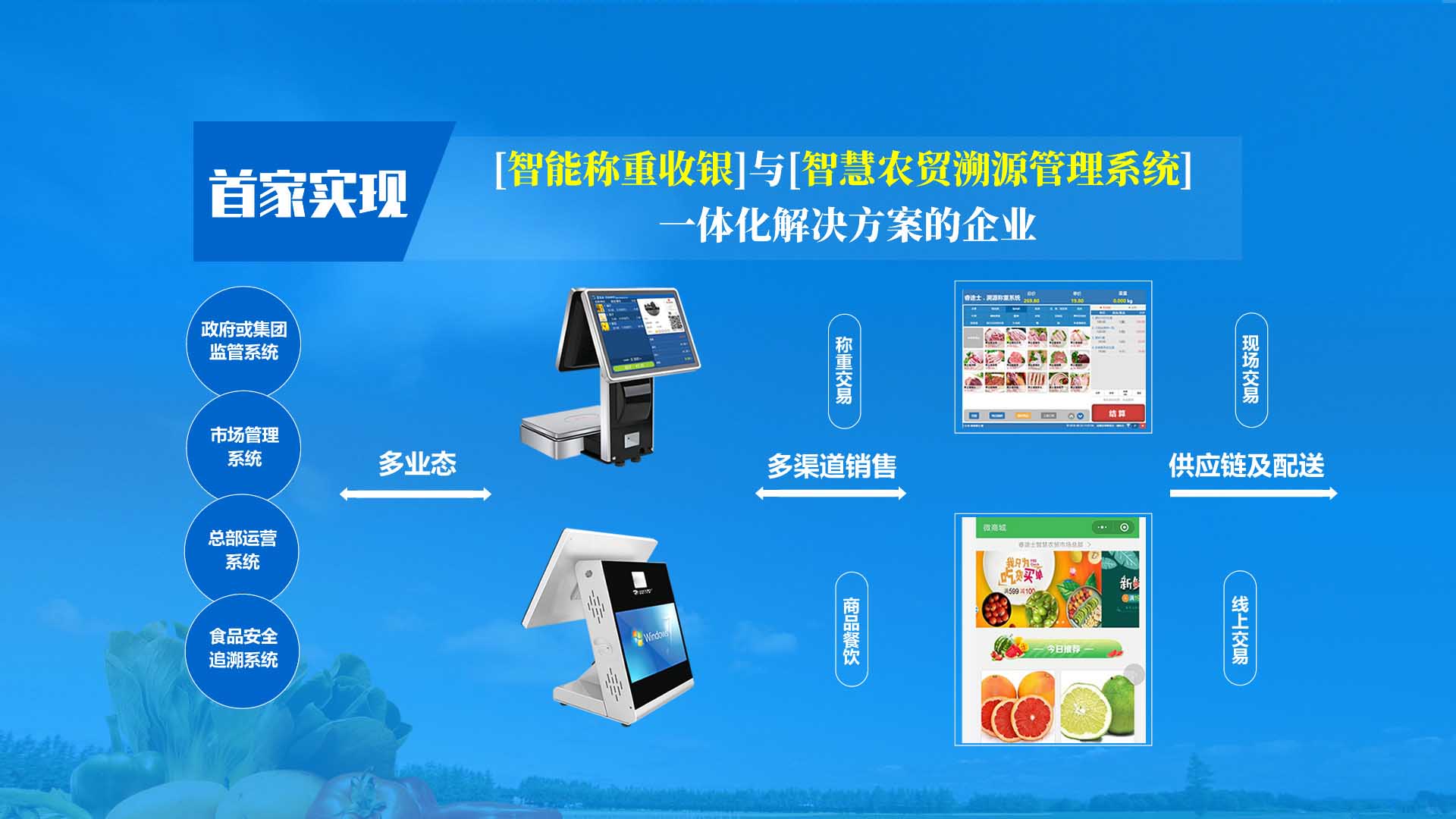 創(chuàng)新實(shí)現(xiàn)了【智慧農(nóng)貿(mào)溯源管理系統(tǒng)】與【智能稱重收銀】一體化解決方案,集市場管理、運(yùn)營管理、溯源追溯、智能收銀大數(shù)據(jù)運(yùn)用于一體,硬件、軟件與管理系統(tǒng)完美結(jié)合。適用于農(nóng)批、農(nóng)貿(mào)市場蔬菜、生鮮、水果、水產(chǎn)、肉類、熟食等稱重和非稱重銷售;由于采用一體化設(shè)計(jì),解決了傳統(tǒng)農(nóng)貿(mào)市場無法實(shí)現(xiàn)的信息化、智能化、可追溯的管理問題;使稱重、收銀、追溯、管理、更透明、公正、安全,讓顧客無后顧之憂,給管理工作帶來極大的便捷與高效,對國內(nèi)農(nóng)產(chǎn)品行業(yè)的發(fā)展、農(nóng)產(chǎn)品流通管理起到了典范作用。 【睿途士首創(chuàng)】顛覆傳統(tǒng)的“智慧農(nóng)貿(mào)市場系統(tǒng)”,解決了傳統(tǒng)農(nóng)貿(mào)系統(tǒng)單一安卓掛屏,昂視不方便看、不直觀、無互動(dòng)性,傳輸信息不齊全、不穩(wěn)定的問題,也解決了按鍵電子秤商品難找、商品代碼難記、按鍵操作不靈活、支付不智能,對收銀管理、銷售商品、菜名、菜價(jià)、打折、優(yōu)惠、會員、線上下單、采購等無法實(shí)現(xiàn)實(shí)際菜品交易和追溯等問題。 更具顛覆性的是睿途士智慧系統(tǒng)擁有三大管理平臺(市場管理平臺、總部運(yùn)營管理平臺、商戶后臺管理平臺)、一個(gè)可視操作前臺和三大追溯功能,讓遠(yuǎn)程管理、數(shù)據(jù)傳輸、人機(jī)互動(dòng)、智能控制、移動(dòng)支付、大數(shù)據(jù)、互聯(lián)通信、云端存儲、人工智能、智能城市、電子定位、智能收銀等功能得以實(shí)現(xiàn)。